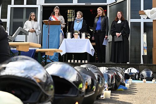 Die letzte Kirche vor dem Feldberg! Ein besonderer ökum. Gottesdienst unter dem Motto: „Wohin geht die Reise?“ wurde am 23.04.23 um 10.00 Uhr auf dem Kirchenvorplatz der St. Hedwigskirche, Eisenhammerweg 10, gefeiert. Auch in diesem Jahr kamen viele aus nah und fern bei herrlichem Wetter, denn mit Beistand von „oben“ fährt sich‘s besser. Sie kamen und wollten singen und beten und ihre blitzsauberen und rassigen Maschinen segnen lassen. 42 Motorräder (und auch 20 Fahrräder), in Reihe aufgestellt, waren eine beeindruckende Kulisse. Die PastRefin Elke Peglow und die ev. Pfrin Stefanie Eberhardt von der Heilig-Geist-Kirche predigten an Hand der ausgeteilten „Karte deines Glaubens“ aus den verschiedenen Lebenssituationen. Motorradhelme wurden in Kreuzform vor dem Kircheneingang ausgelegt und jeder hat eine brennende Kerze dazugestellt. Motorradfahren birgt auch Gefahren in sich und ist somit eine große Verantwortung, denn man sollte nicht schneller fahren, als dein Schutzengel fliegen kann. Damit alle beim Fahrspaß gesund bleiben mögen, erteilten die Zelebranten ihren Segen für ein unfallfreies Motorrad-Jahr und besprengten die Motorräder und Fahrräder mit Weihwasser. Pfrin Eberhardt erteilte jeden der wollte einen Einzelsegen. Es wurde an diesem Morgen viel gesungen. Die Band Jambo begleitete die Sänger musikalisch. Es war auch kommunale Prominenz dabei. Bürgermeisterin Antje Runge, die Brunnenkönigin Felicitas I. mit Brunnenmeister Steff, der Stadtverordnetenvorsteher Lothar Köhler und die Presse. Sie brachten ihre Fürbitten vor und Frau Runge sprach ein Grußwort. Und jeder Biker erhielt einen blauen Aufkleber eines Fisches, der zuvor gesegnet wurde. Die Kollekte ging diesmal an den ambulanten Hospizdienst St. Barbara, deren Vertreter den Gottesdienst miterlebten und für die Kollekte dankten. Und jeder Besucher bekam in schriftl. Form den Psalm 139 mit auf dem Heimweg. Bevor sich die Motorräder in Bewegung setzten, steuerten sie den Getränkestand mit Kaffee, Saft, Tee, Wasser und Kuchen an und ließen sich die von philippinischen Frauen die frischgebackenen Frühlingsrollen und Nudeln schmecken. Und die Biker aus verschiedenen Regionen hatten sich viel zu erzählen. Sie alle wollen nächstes Jahr wiederkommen, denn die familiäre Atmosphäre gefällt den Bikern und den Gästen in St. Hedwig besonders.