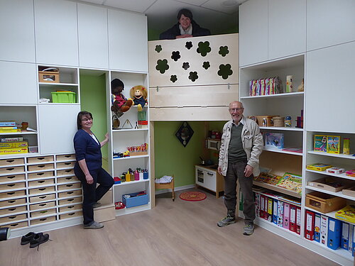 Die neuen Möbel wurden an zwei Wänden angebracht. In der Ecke gibt es eine kleine Höhle, wo die Kinder in die Welt der Kochkunst eintauchen können. Dort steht eine kleine, kompakte Küche mit Herd, Spüle, Backofen, Unterschrank und sogar eine kleine Mikrowelle für die kleinen Köche. Nach oben gelangt man über eine versteckte Treppe, die hinter einem Wandregal eingebaut ist. Oben angelangt, haben die Kinder alles im Blick. Dort können sie ganz in Ruhe und versteckt spielen. Die Seitenteile, die links und rechts von der Höhle angebracht wurden, sind bis auf die Decke mit vielen möglichen Stauräumen für Spielzeuge, Puzzles, Bücher usw. vorgesehen. Hier stehen Schränke, Regale und Schubladen, die bereits fast voll ausgelastet sind. Auch die restlichen Möbel in diesen Ü3 Gruppen wurden alle passend und kindgerecht in den Räumen aufgestellt.