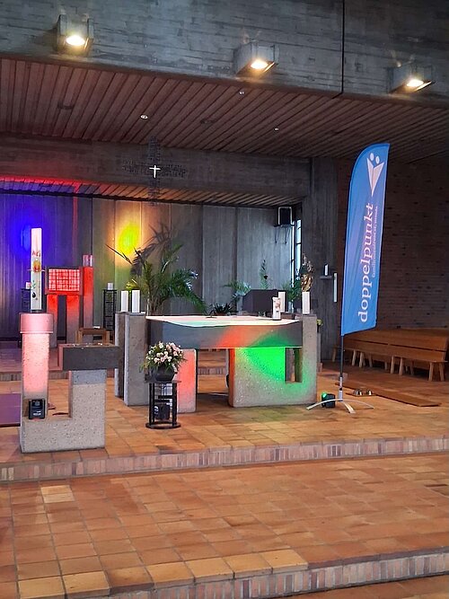 Donnerstag, 04. September, war es endlich soweit! Die bunt illuminierte Kirche zeigte von Anfang an, dass heute etwas Besonderes in der Kirche St. Sebastian stattfindet. Der FREIRAUM in der Kirche St. Sebastian wurde an diesem Abend vom Familienzentrum Doppelpunkt bespielt.