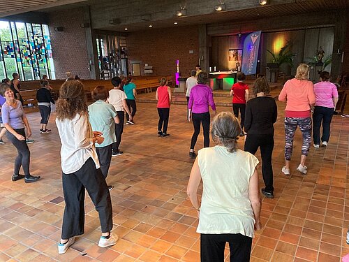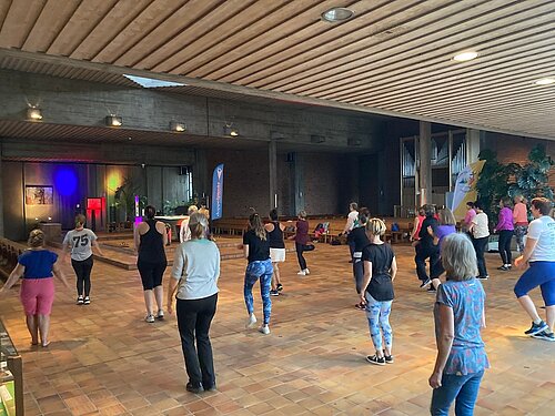 Eingeladen hatten wir unter der Überschrift: „Kirche trifft Lateinamerikanischen Fitnesstanz“ und waren von der großen Resonanz selbst überrascht. Über 30 Frauen sind dieser Einladung gefolgt und waren neugierig, was sie an diesem Abend erwartet. Nach einer kurzen Begrüßung und Erläuterung, was sich hinter dem Begriff „FREIRAUM“ versteckt, gab es eine Einstimmung in den Abend. Ein Satz, der einigen im Gedächtnis hängen geblieben ist, lautete:„…“Oh Mensch, lerne tanzen, sonst wissen die Engel im Himmel nichts mit Dir anzufangen…“ , übrigens ist das Zitat schon 1500 Jahre alt und stammt von Augustinus. Und dann ging es auch schon los. Sabrina Fondacaro, Zumbalehrerin beim TSGO, brachte uns in Schwung und manche auch ins Schwitzen. 45 Minuten lang erklangen Lateinamerikanische Klänge durch den Kirchenraum und brachten uns alle in Bewegung. Mit einer Entspannungs- und Stretchingphase beendeten wir den sportlichen Teil. Nun waren alle zum Fitness-Buffet im Kirchenvorraum eingeladen. Frisch gemixte Smoothies, Salate, Brote mit Aufstrich, Müslipralinen und Erdnüsse schmeckten nach der sportlichen Anstrengung besonders gut. Das meiste war aus „geretteten Lebensmitteln“ zubereitet. Es entstand eine super lockere Gesprächsatmosphäre und wir haben im wahrsten Sinne des Wortes über Gott und die Welt geredet.