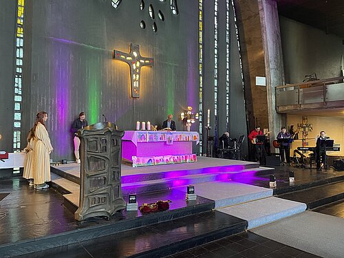 St. Hedwig hatte am 11.05.2024 St. Hedwig zu 58. Jahre Kirchweih und zum 25-jährigen Bestehen des Förderkreises St. Hedwig zu einem Festgottesdienst, den Pater Matthäus leitete, eingeladen. Der Innenraum wurde feierlich mit LED angestrahlt und die Band Jambo spielte flotte Lieder zum Mitsingen aus dem neuen Gotteslob. Über 90 Besucher waren der Einladung gefolgt. Frau Quirin und Frau Hyacinthe erläuterten im Dialog was der Grund des Förderkreises ist und für was er zweckgebunden die Spendengelder einsetzt, nämlich dem Erhalt der St. Hedwigskirche und für kulturelle Zwecke in der Kirche, z. B. Ausstellungen. Die Betreuerinnen der KiTa stellten in Wort und Bild vor, wie Kinder Kirche im Allgemeinen sehen und die St. Hedwigskirche im Besonderen. Nach dem Festgottesdienst waren alle zu einem reichhaltigen Buffet und Getränke mit Weinstand eingeladen. Im Vorraum wurde ein Film über den Bau des einmaligen parabelförmigen Gebäudes und seinem mächtigen Kirchturm, das inzwischen unter Denkmalschutz steht, gezeigt. Draußen wurde bei herrlichem Wetter noch lange gefeiert und viele gute Gespräche geführt. Einen herzlichen Dank an alle ehrenamtlichen Helfer, die dieses großartige Fest möglich gemacht haben.