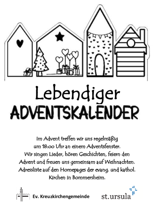 Der Advent ist eine Zeit der Gemütlichkeit mit Plätzchen und Kerzenlicht, aber auch des Stresses mit Weihnachtseinkäufen und vielen Terminen. Doch eigentlich ist der Advent die Vorbereitungszeit auf Weihnachten. Darum soll es auch in diesem Jahr wieder den „Lebendigen Adventskalender“ in Bommersheim geben. Wir singen Lieder, hören Geschichten, staunen und freuen uns gemeinsam auf Weihnachten. Wer als Gastgeber mitmachen und ein Fenster gestalten möchte, meldet sich gerne in einem der Gemeindebüros der Bommersheimer Kirchengemeinden. Nicht nur Familien, sondern auch Einrichtungen und Firmen können Gastgeber sein. Die Liste mit den Adressen der Adventsfenster werden hier veröffentlicht sowie in den Schaukästen der katholischen und evangelischen Kirchen in Bommersheim. Herzliche Einladung an alle!