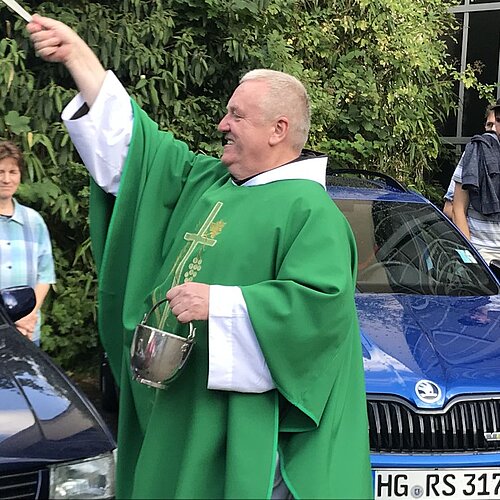 Der Einladung zum Gottesdienst mit Reisesegen am Samstag, den 15.07.2023 um 18.00 Uhr in St. Hedwig waren rund 70 Besucher gefolgt. Die PKW und die Fahrräder wurden vor Beginn des Gottesdienstes auf den Kirchvorplatz geleitet, wo sie in einer Reihe Aufstellung fanden. Pater Matthäus sprach speziell die Urlauber an, sie mögen gesund, wohlbehalten und gut erholt von ihren Reisen zurückkehren. Auch für kurze Reisen sei der Segen gedacht. Es müssen ja nicht immer weite Reisen sein. Danach wurde ein Flyer an alle ausgeteilt, auf dessen Rückseite ein Gebet steht. Dieses Gebet wurde auf dem Kirchvorplatz von allen Anwesenden gebetet. Zum Schluss erteilte Pater Matthäus den Reisesegen für alle Flug-, Auto- und Bahnreisende und besprengte die Gläubigen vor ihren Fahrzeugen und Fahrrädern mit Weihwasser und wünschte allen eine gute Ferienzeit. Mit dem Segen von oben reist es sich eben besser.
