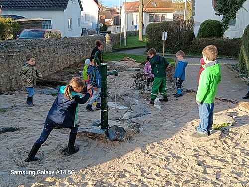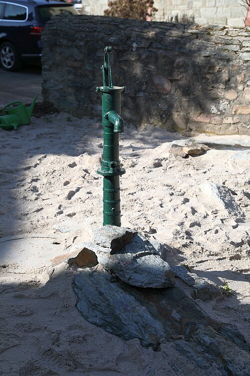 Kinder können den Platz rund um die Pumpe zum Spielen und Entdecken nutzen. Auf diese Weise soll ökologisches Bewusstsein geweckt und Kindern mit allen Sinnen den sorgsamen Umgang mit Ressourcen nähergebracht werden.