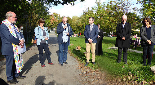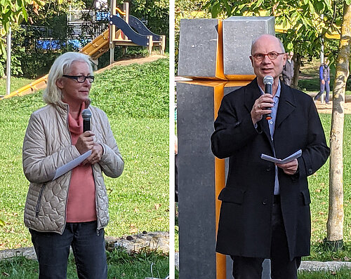 Die 1. Vorsitzende des Fördervereins St. Bonifatius, Christine Lenz, führte ein und erzählte von der Geschichte, wie es zu diesem Wegesymbol und seiner Idee kam. Viele haben geholfen, dass das Projekt nun nach fünf Jahren so schön geworden ist. Sie dankte dem anwesenden Künstler, Hans Rams, der auch die künstlerische Innenausstattung von St. Bonifatius entwickelt hat. Heinrich Schlomann vom evangelischen Kirchenvorstand sprach von der Freude am ökumenischen Projekt, ein Sinnbild für den Zusammenhalt. Auch Bürgermeister Bonk, der sogar die Stühle für die älteren Leute tatkräftig mitaufgebaut hat, betonte den Wert des solidarischen Zusammenhalts in der Stadt Steinbach und wies auf die positive Rolle der beiden christlichen Gemeinden hierbei hin.