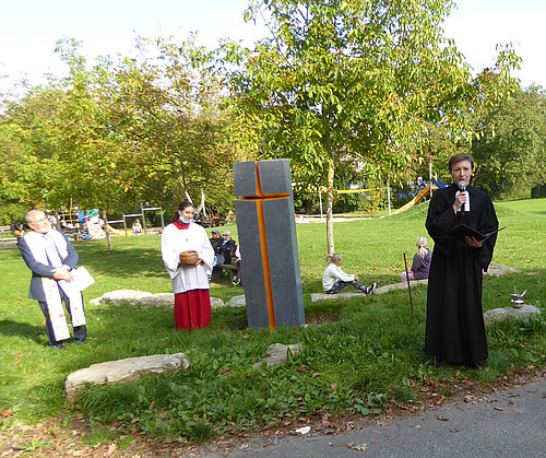 Pfarrer Unfried segnete das neue Wegekreuz und sprach von der Bedeutung seiner Vertikalen, die uns erdet und die uns mit dem Himmel verbindet, und der Bedeutung seiner Horizontalen, die unser Herz weiten solle, für die Anliegen und der Schönheit der Welt. Beides helfe, dass Jesus mit uns gehe auf unseren Wegen.