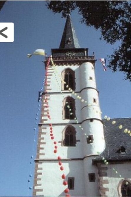 hieß früher die "Hohe Wacht". Er bot Platz für die Glocken und einen Wächter, der auf Feuer und Feinde achten mußte, um mit der Glocke auf dem Umgang Alarm zu schlagen. Der Zugang zum Turm war ursprünglich auf dem Kirchenspeicher, später in der Turmhalle. 1978 wurde der Sockel der Wendeltreppe aufgebrochen, und die Wendeltreppe beginnt seitdem auf dem Kirchplatz. 168 Stufen sind es bis zum Umgang. Dort sieht man an klaren Tagen die nahen Berge des Taunus, in der Ferne Vogelsberg, Spessart und Odenwald sowie den Rhein und das vielfältige Leben in der Ebene. Die Gliederung der Geschosse des Turmes beginnt mit der heute verglasten Halle im Erdgeschoss. Hier steht das alte Kirchhof-Kreuz, das eine Familie Sonderßhauser, aus Salzburg kommend, gestiftet hat. Daneben steht der spätgotische Taufstein, der sich länger außerhalb als in der Kirche befand. Über der Holzbalkendecke, die das ursprüngliche Kreuzgewölbe ersetzt, befinden sich drei Geschosse des Kirchturm-Museums. Sie waren 1942 als öffentlicher Luftschutzraum für die Bewohner der Altstadt zum Schutz vor Fliegerangriffen eingebaut worden. Die dicke Betondecke ist in der darüberliegenden Uhrenkammer zu sehen. Das oberste Geschoss ist die Glockenkammer.
