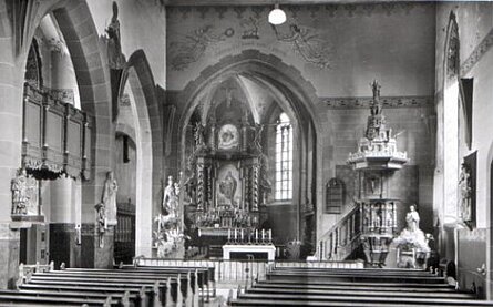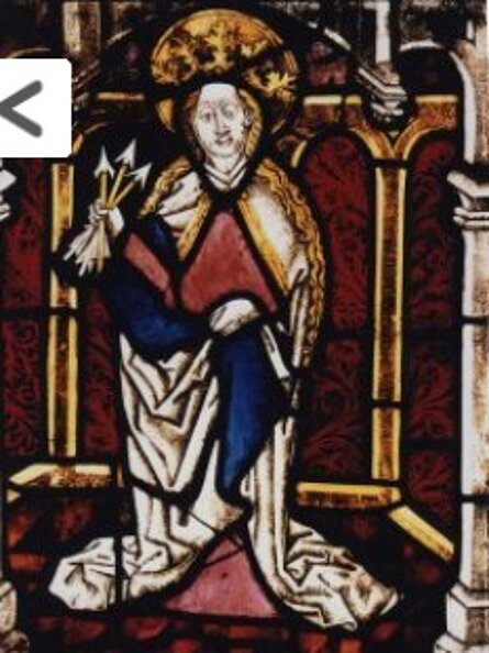 Die Patronin unserer Pfarrei: Nach der Legende war Ursula eine christliche Königstochter aus Britannien. Ein benachbarter Prinz, Aeterius genannt, begehrte sie zur Frau. Da er kein Christ war, bat Ursula um Bedenkzeit. Mit elf Freundinnen wollte sie auf einer Wallfahrt nach Rom eine Antwort finden. Auf der Rückreise begegneten Ursula und ihre Schar in Mainz dem Prinzen Aeterius, der aus Liebe Christ geworden und Ursula entgegengereist war. Gemeinsam fuhren sie mit einem Schiff rheinabwärts gegen Köln, wo sich ihnen die kriegerischen Hunnen entgegenstellten. Diese töteten die Wallfahrer wegen ihres christlichen Glaubens, die Hunnenhorde erschoss Ursula und ihre Begleiterinnen mit Pfeilen. So wurde ein Pfeil das Symbol für ihren Märtyrertod.