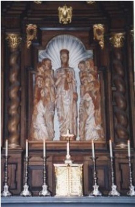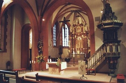Der Altartisch bildet das Zentrum der Kirche. Das barocke Kreuz zeigt den Platz: Hier feiert die Gemeinde die Eucharistie. Georg Hieronymi entwarf den kleineren Sandsteinblock, der 1980 geweiht wurde. Reliquien der römischen Heiligen Marcellinus und Florentina sind in ihm aufbewahrt.