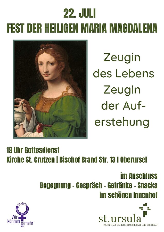 Maria Magdalena…. Was haben wir nicht schon alles über sie gehört?! Sünderin sei sie gewesen, Büßerin, Verführerin. Die entsprechenden Renaissancegemälde einer erotischen Frau mit wallendem Haar und entblößter Brust kennen die meisten von uns. Dass sie aber vor allem eine ernstzunehmende Frau aus dem engsten Kreis Jesu, ja sogar eine Zeugin der Auferstehung war, soll das Thema unseres Gottesdienstes zum Festtag der Hl. Maria Magdalena am 22. Juli sein. Unsere herzliche Einladung dazu finden Sie in diesem Newsletter. Was wäre eigentlich, wenn Maria und die sie begleitenden Frauen über die Begegnung mit Jesus am Grab geschwiegen hätten? Unter anderem dieser Frage geht eine virtuelle Ausstellung im Diözesanmuseum Bamberg über zwölf bedeutende Frauen der Kirchengeschichte nach. Näheres dazu finden Sie im Newsletter. Und was wäre geschehen, wenn Frauen nicht über die Jahrhunderte hinweg an Auftrag und Gestaltung unserer Kirche mitgewirkt hätten? Die beeindruckende Frauenfriedenskirche in Bockenheim hätte es dann gar nicht gegeben. Wir haben sie im Frühjahr besucht. Von unserer Exkursion berichten wir ebenfalls in diesem Newsletter. Viel Vergnügen beim Lesen! Ihnen und Euch wünschen wie einen schönen Sommer, erholsame Ferien und Gottes Segen Susann v. Winning im Namen aller Mitglieder des Ausschusses „Wir können mehr! Frauen in der katholischen Kirche“ ![]() Wir feiern das Fest der Apostolin Maria Magdalena. Zuerst im Gottesdienst und danach im Innenhof von St. Crutzen mit Getränken und kleinen Snacks. ![]() Exkursion zur FrauenfriedenskircheFRAUEN - ein THEMA IN UNSERER KATHOLISCHEN KIRCHE, das uns sehr am Herzen liegt. FRIEDEN - ein so drängendes ANLIEGEN in Kirche und Gesellschaft, in Politik und im persönlichen Gebet. Beides zusammen zu denken, hat uns zur Exkursion in die FRAUENFRIEDENSKIRCHE in Frankfurt Bockenheim am Sonntag Nachmittag, 3. März 2024 geführt. ![]() ERZBISCHOF SPENDET HÖHERE WEIHE AN FRAU Erste orthodoxe Diakonin der Neuzeit sakramental geweihtHARARE ‐ Die katholische Kirche diskutiert seit Jahren über die Weihe von Frauen zu Diakoninnen. In der Orthodoxie ist man jetzt weiter: Im Patriarchat von Alexandria wurde die erste Frau seit der Zeit der frühen Kirche zur Diakonin geweiht. „Frauen. Taten. Werke. Contemporary – 12 Dialoge“„Frauen zahlen einen hohen Preis, um ihrer Berufung zu folgen.“ Wenn Sie sich aus dem Verteiler wieder austragen möchten, nutzen Sie bitte den folgenden Link: Abmelden. |