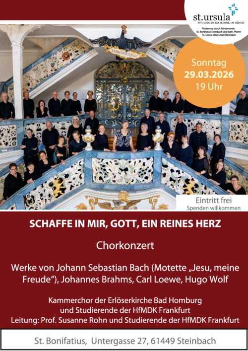 Das Chorkonzert findet in der katholischen St. Bonifatiuskirche, Steinbach (Taunus), Untergasse 27 statt. Eintritt ist frei. Wir freuen uns über Ihre Spende!