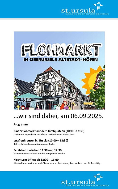 …wir sind dabei, am 06.09.2025, und stellen das Kirchplateau vor der Pfarrei St. Ursula Kirche für einen Kinderflohmarkt sehr gerne kostenfrei zur Verfügung.