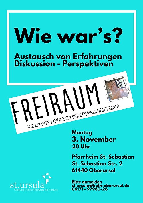 Der FREIRAUM ist/war ein zeitlich begrenztes Experiment. Wenn man experimentiert, gehört eine Auswertung dazu. Dazu laden wir am 3. November um 20 Uhr ein. Pfarrheim St. Sebastian, St. Sebastian Straße 2, Oberursel Stierstadt