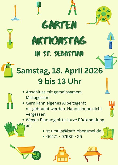Damit es so bleibt und weitergeht, brauchen wir Hilfe. Wir laden zu einem Garten-Aktionstag am 18. April ein. 9 bis 13 Uhr. Abschluss ist ein gemeinsames Mittagessen, zu dem alle eingeladen sind. Wir haben schon einige Aktionstage gemacht und können sagen: Die Stimmung war immer gut und es hat Spaß gemacht. Ganz herzliche Einladung zum Mitmachen! Wir treffen uns vor dem Pfarrheim, St. Sebastian Str. 2. Wegen der Planung freuen wir uns über eine kurze Anmeldung über st.ursula@kath-oberursel.de
