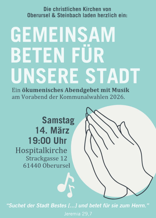 Am Samstag, 14. März 2026, um 19:00 Uhr laden die christlichen Kirchen von Oberursel und Steinbach zu einem ökumenischen Abendgebet mit Musik in die Hospitalkirche Oberursel ein.