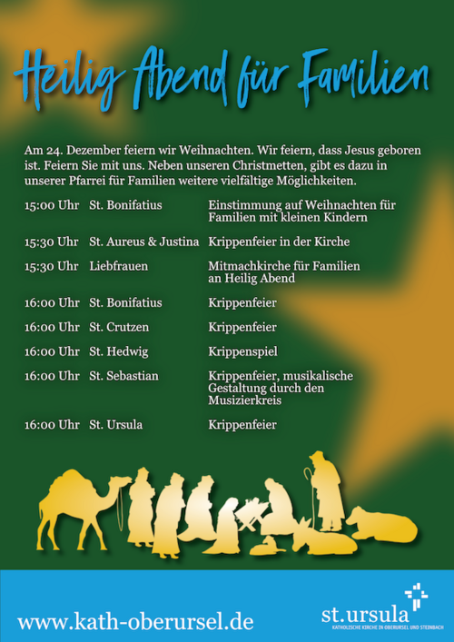 Am 24. Dezember feiern wir Weihnachten. Wir feiern, dass Jesus geboren ist. Feiern Sie mit uns. Neben unseren Christmetten, gibt es dazu in unserer Pfarrei für Familien weitere vielfältige Möglichkeiten.