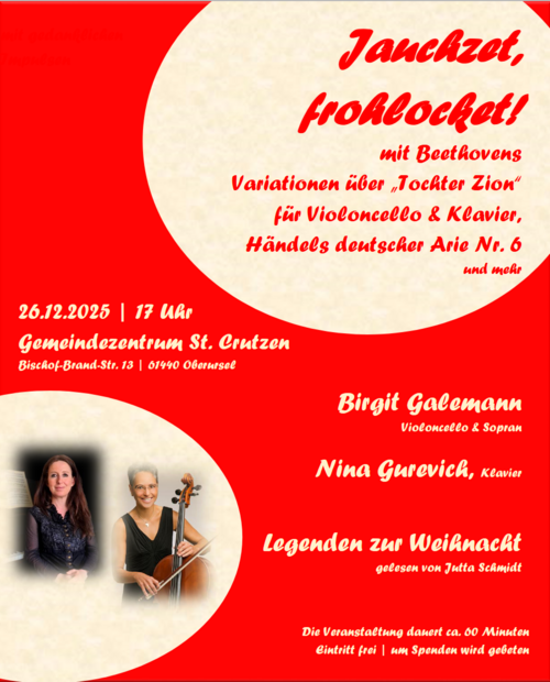 mit Beethovens Variationen über „Tochter Zion“ für Violoncello & Klavier, Händels deutscher Arie Nr. 6 und mehr. Es musizieren Birgit Galemann (Violoncello & Sopran) und Nina Gurevich (Klavier). Jutta Schmidt liest „Legenden zur Weihnacht“. Die Veranstaltung dauert ca. 60 Minuten. Der Eintritt ist frei. Um Spenden wird gebeten. Einlass ab 16:15 Uhr.
