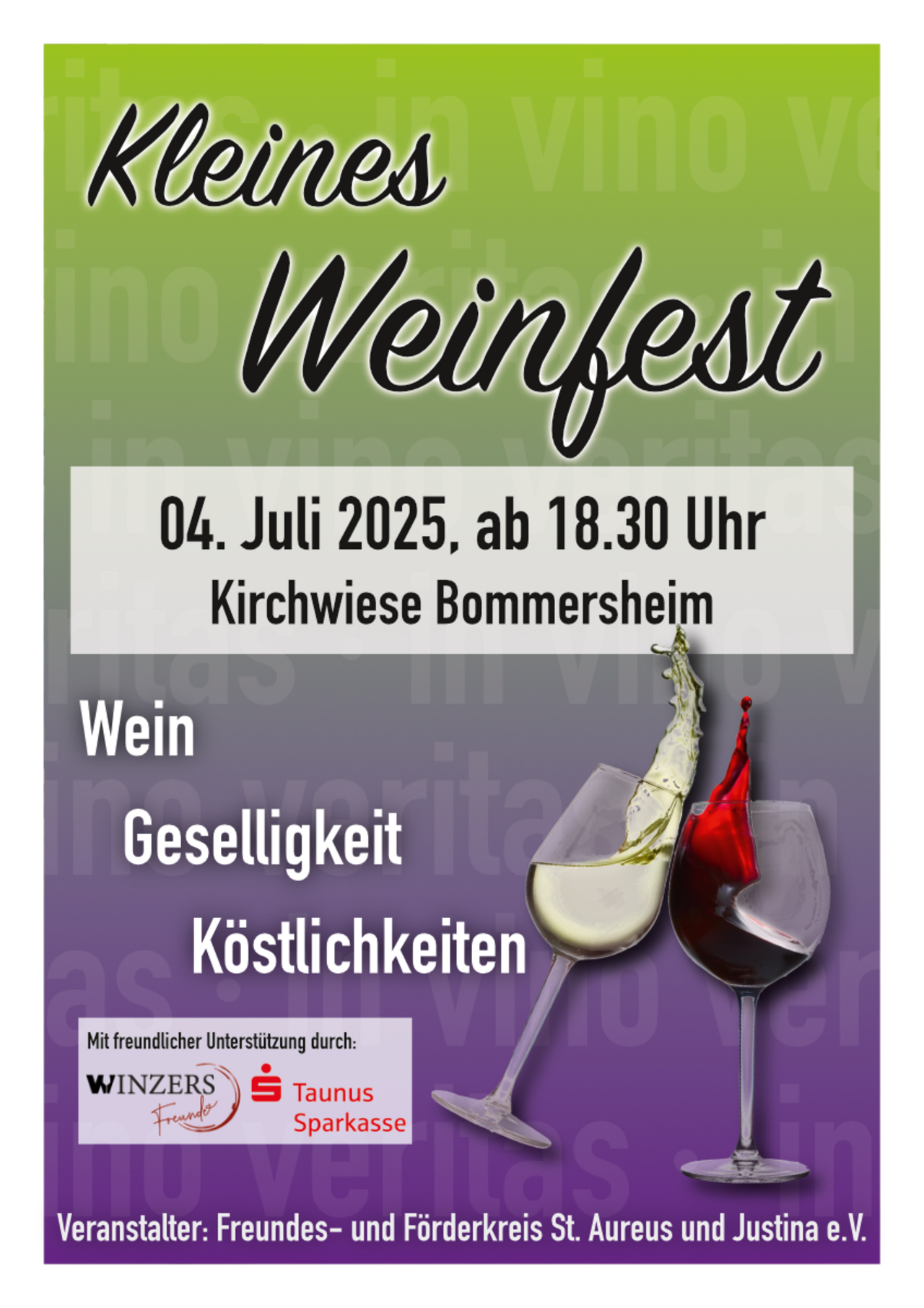 Der Freundes- und Förderkreis St. Aureus und Justina e. V. lädt am 4. Juli 2025 ab 18.30 Uhr herzlich ein zu einem gemütlichen Sommerabend bei Wein und verschiedenen Snacks auf der Kirchwiese des Gemeindezentrums St. Aureus und Justina.