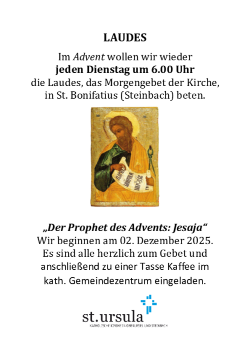 Im Advent wollen wir wieder jeden Dienstag um 6.00 Uhr die Laudes, das Morgengebet der Kirche, in St. Bonifatius (Steinbach) beten. Wir beginnen am 02. Dezember 2025.