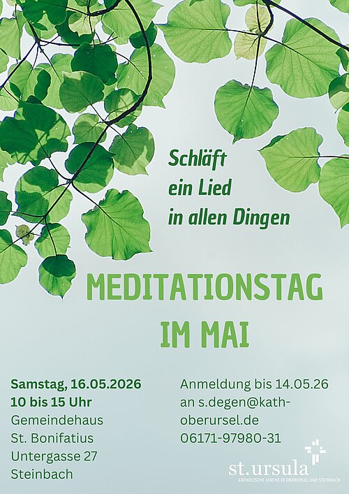 Die Qualitäten der Kontemplation entdecken: Mit sich und der Welt in Einklang kommen. Staunen. - Zeiten der Stille in Gemeinschaft - Elemente von Naturerfahrung, Körpergebet, Musik - 10 bis 15 Uhr - Anmeldung erforderlich bis 08.05.2026 über s.degen@kath-oberursel.de oder das zentrale Pfarrbüro