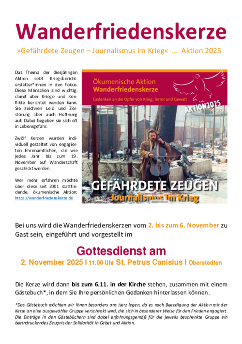 Die Wanderfriedenskerze wird bei uns in St. Petrus Canisius (Landwehr 3, 61440 Oberursel-Oberstedten) vom 2. bis zum 6. November zu Gast sein, eingeführt und vorgestellt im