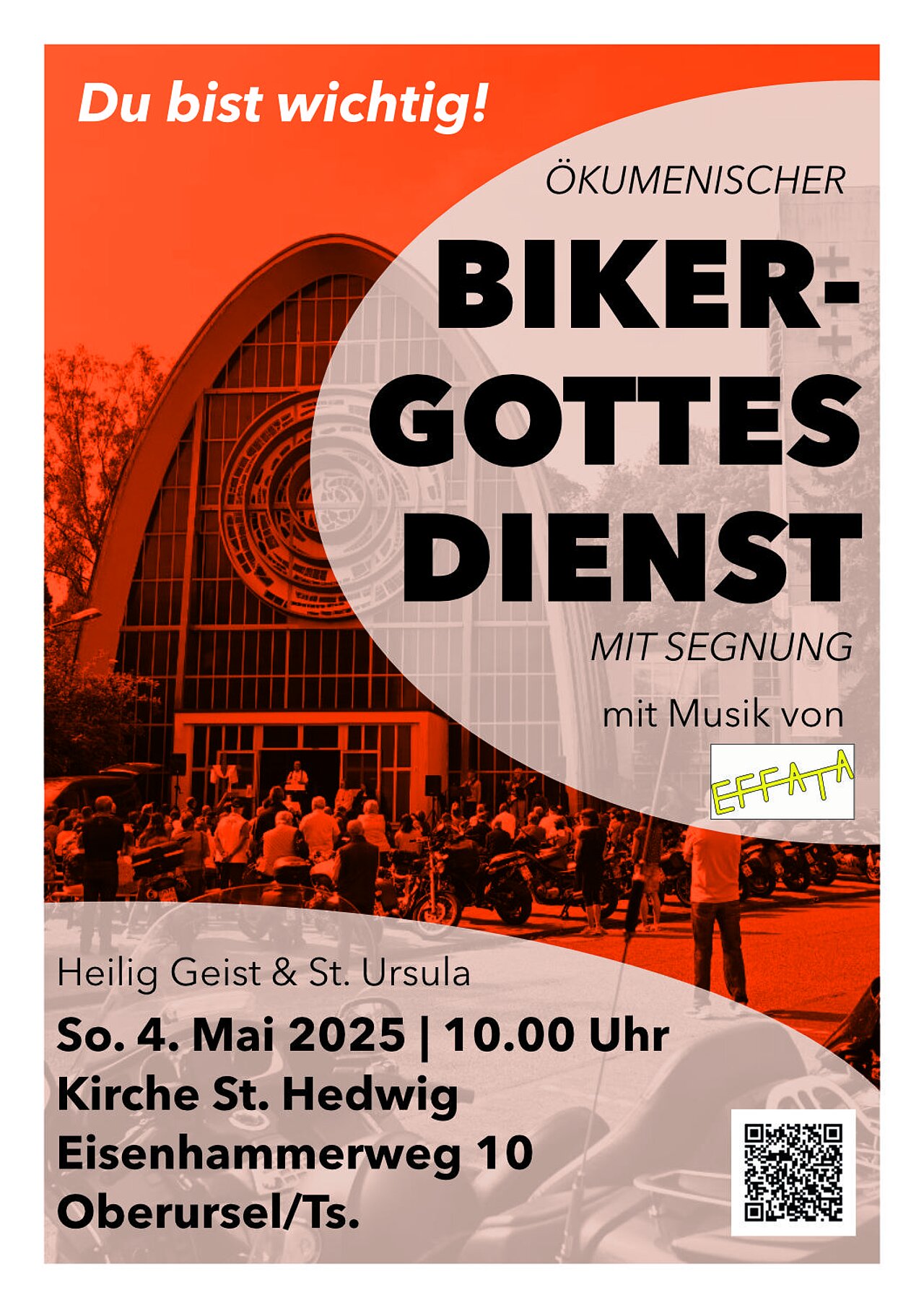 Am So. 4. Mai 2025 feiern wir gemeinsam mit der evangelischen Heilig Geist Gemeinde einen ökumenischen Biker-Gottesdienst vor der Kirche St. Hedwig. Für Musik sorgt die Band EFFATA.
