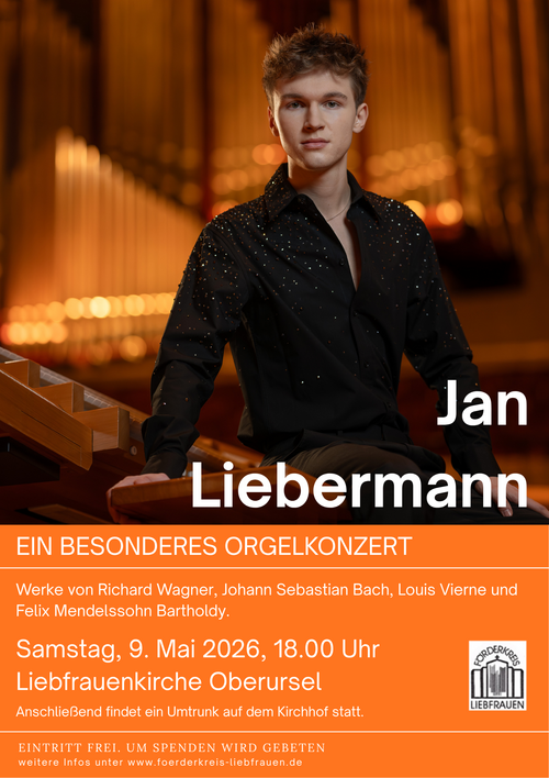 Am Samstag, den 9. Mai um 18 Uhr präsentiert Jan Liebermann, der "Shootingstar der Orgelszene" an der frisch sanierten Klaisorgel der Liebfrauenkirche ein Orgelfeuerwerk von Wagner, Bach, Vierne und Mendelssohn-Bartholdy. Eintritt frei, um Spenden wird gebeten Anschließend gibt es einen Umtrunk an der Kirche.