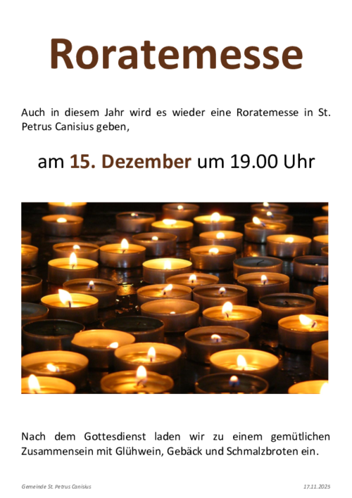 Auch in diesem Jahr wird es wieder eine Roratemesse in St. Petrus Canisius geben, am 15. Dezember um 19.00 Uhr.