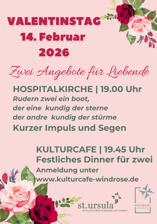 Am Valentinstag gibt es zwei schöne Angebote für Paare. Um 19 Uhr ist eine Segensfeier in der Hospitalkirche. Anschließend laden wir zu einem Glas Sekt oder Orangensaft ins Kulturcafé ein. Dort kann es dann weitergehen mit einem festlichen Dinner für zwei. Dafür bitte anmelden über www.kulturcafe-windrose.de - Das Drei-Gang-Menü (ohne Getränke) kostet pro Person 30 Euro.