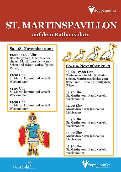 Am Martinsmarkt in Oberursel am 08. und 09. November, sind wir, jeweils ab 13:00 Uhr mit dem „doppelpunkt familienzentrum st. ursula“ dabei. Besuchen Sie uns in unserem St. Martinspavillon auf den Rathausplatz.