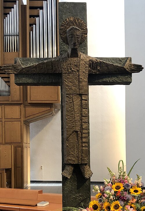 Für mich zeigt dieses Kreuz einige interessante Perspektiven: Jesus am Kreuz ist nicht tot. Er schaut mich freundlich an. Ich sehe Christus in seiner Herrlichkeit mit Gloriole und einem Königsmantel bekleidet mit weit ausgestreckten Armen. Es ist der königliche Christus, der wie aufgehende Sonne als königlicher Richter der Welt erwartet wird. In diesem Gekreuzigten wird mir nicht das unendliche Leid und die Ungerechtigkeit dieser Welt und unseres Lebens gespiegelt wie in vielen anderen Kreuzesdarstellungen. Gerade die über das Kreuz hinausreichenden ausgestreckten Arme sagen mir: Er hat den Tod besiegt; er wird alle Ungerechtigkeit und alles Leid dieser Welt und auch meines Lebens an ein Ende bringen. Mit ihm kommen die Herren der Welt an ein Ende.